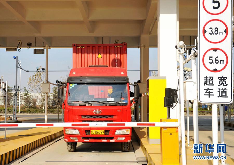 12月18日,在青岛西海岸新区保税物流中心,货车司机领取通关卡。