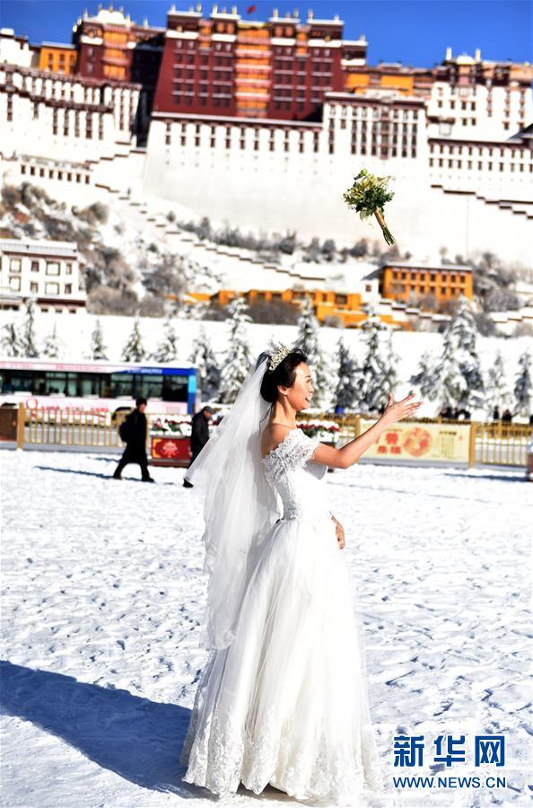 12月19日,一名女士在布达拉宫广场上拍婚纱照。 12月18日,西藏拉萨市迎来今年入冬以来的首场降雪。19日清晨,拉萨雪后初霁,处处银装素裹,尽显雪域高原之美。 新华社记者觉果摄
