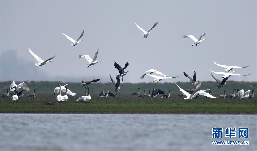 一群小天鹅和豆雁在洞庭湖的一处湿地生境修复工程实验区内飞翔(2月26日摄)。 新华社记者 李尕 摄