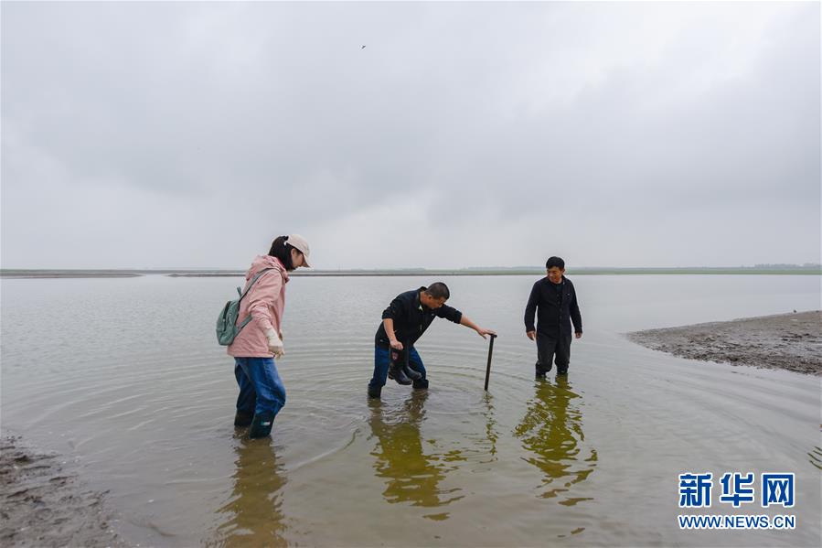 中科院洞庭湖湿地生态系统观测研究站的科研人员邹业爱(中)和同事正在通过洞庭湖湿地一处生境修复工程实验区的水域(10月25日摄)。 新华社记者 张笑宇 摄