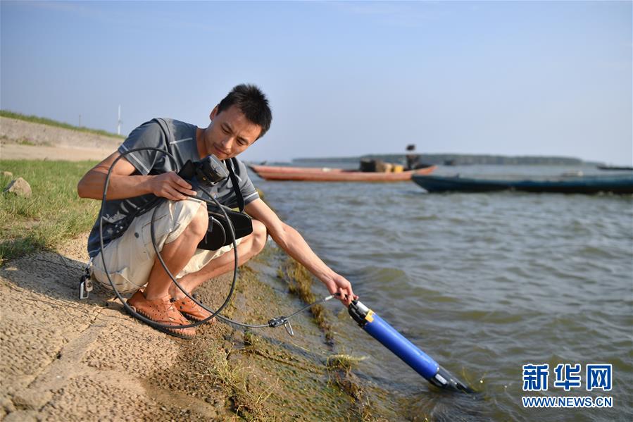 中科院洞庭湖湿地生态系统观测研究站的科研人员李旭在洞庭湖湿地的观测点进行水质检测(8月24日摄)。 新华社记者 薛宇舸 摄