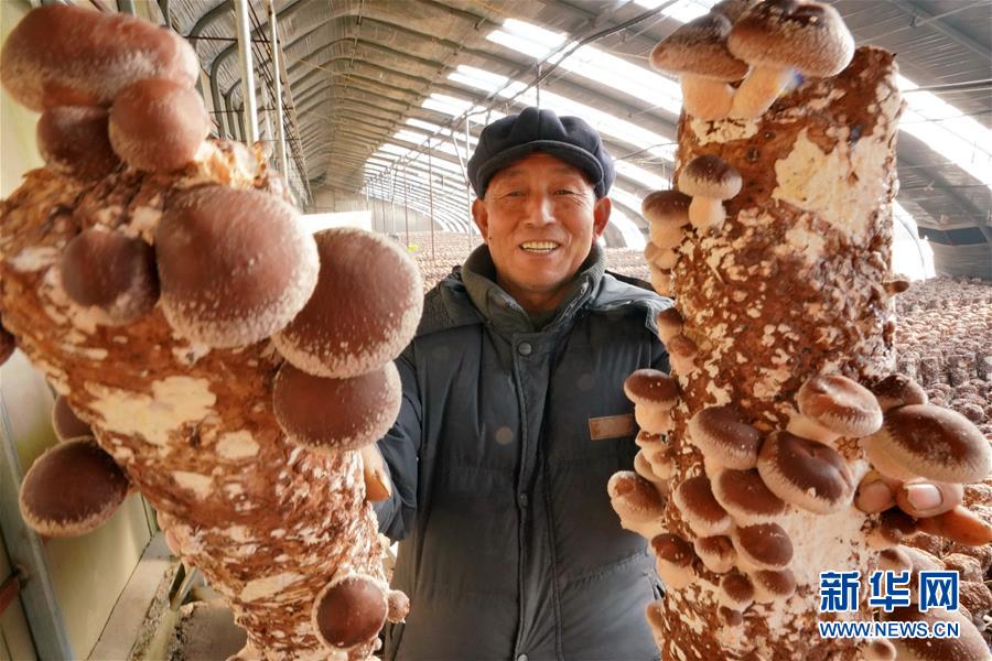 12月20日,唐山市丰润区小美食用菌种植农民专业合作社社员在展示种植的香菇。 新华社记者 牟宇摄