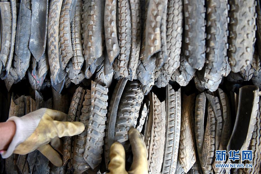 12月20日,在山东省淄博市沂源县大张庄镇大桑树村一扶贫车间,村民在整理加工的废旧轮胎。 今年以来,山东省沂源县大张庄镇把废旧轮胎工艺品加工与扶贫工作结合起来,通过建立扶贫车间、分散加工等方式,带动农户和贫困群众将废旧轮胎加工成动物、卡通人物、机器人等造型,用于旅游景点、公园和街道的美化,变废为宝实现增收。 新华社发(赵东山 摄)