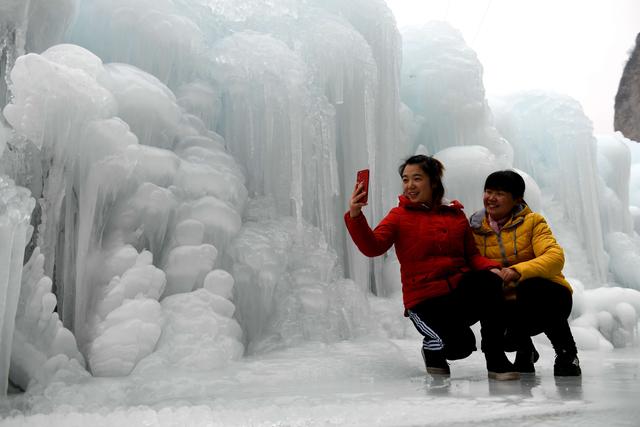 12月20日,在石家庄市平山县沕沕水景区内,游客在冰瀑景观前拍照。新华社发(陈其保 摄)
