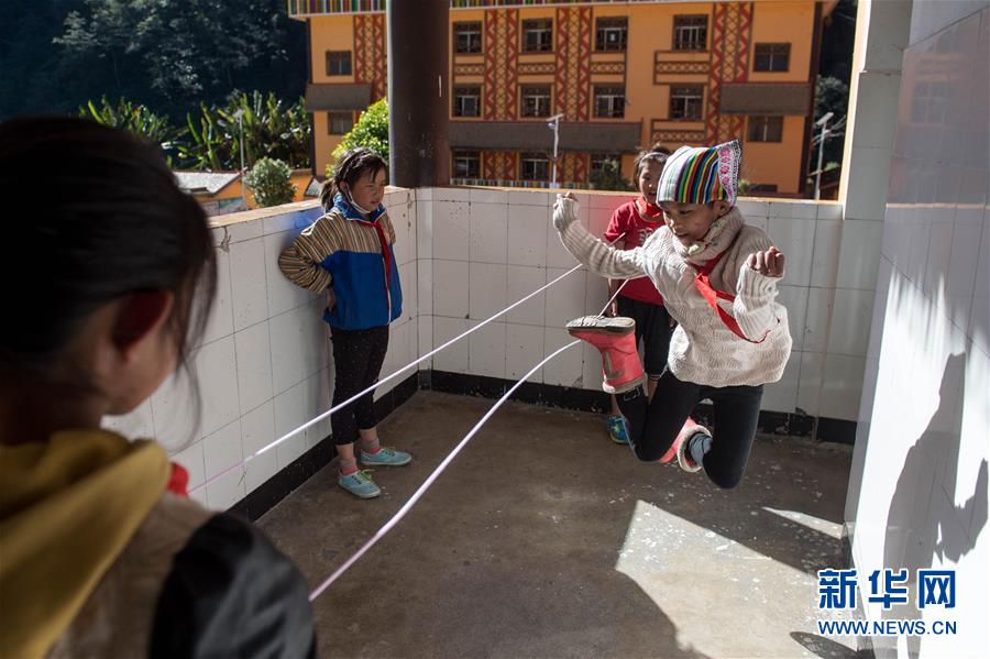 在独龙江乡中心小学,孩子们在跳皮筋(2016年11月23日摄)。 新华社记者 胡超 摄
