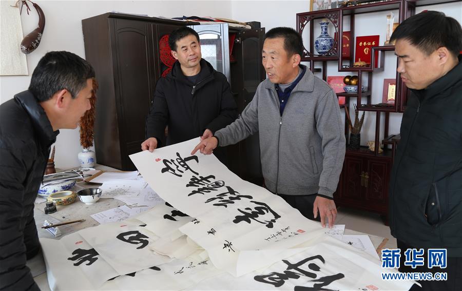 12月21日,山东省滨州市沾化区大高镇小张村村民张新江(右二)与朋友交流书法心得。 新华社发(贾海宁 摄)