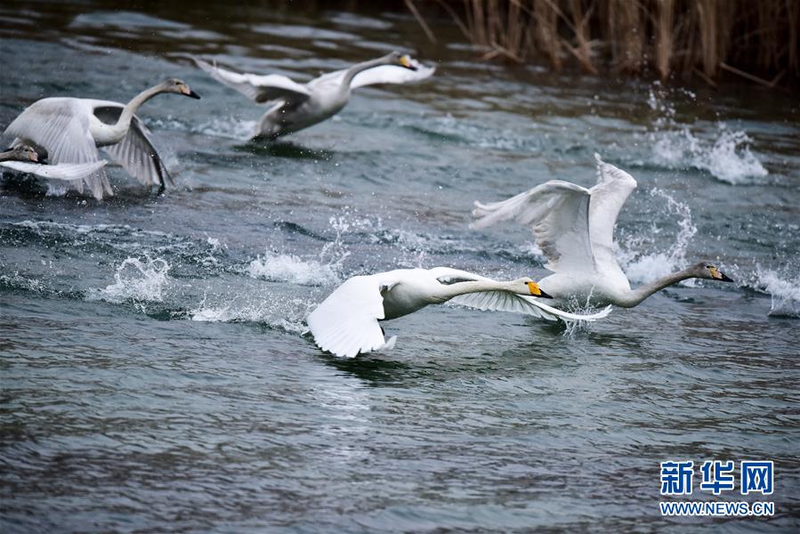 12月21日,几只天鹅在黄河岸边嬉戏。 新华社记者 吴刚摄