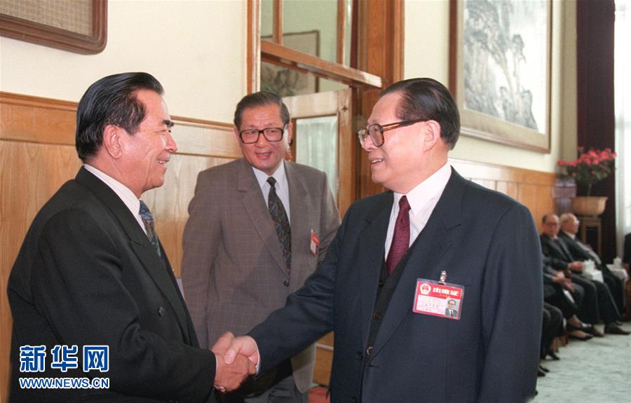 1996年3月17日,八届全国人大四次会议在北京人民大会堂闭幕。江泽民同志与铁木尔·达瓦买提同志亲切握手。 新华社记者王新庆摄