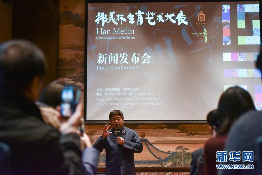 12月21日,故宫博物院院长单霁翔(中)在“韩美林生肖艺术大展”新闻发布会上致辞。 新华社记者 李芒茫 摄