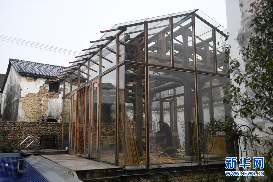12月21日,工人在桐庐县江南镇深澳村修缮改造一间古宅。深澳村有保存完整的古建筑群落,常年吸引大批游客参观。 新华社记者 黄宗治 摄