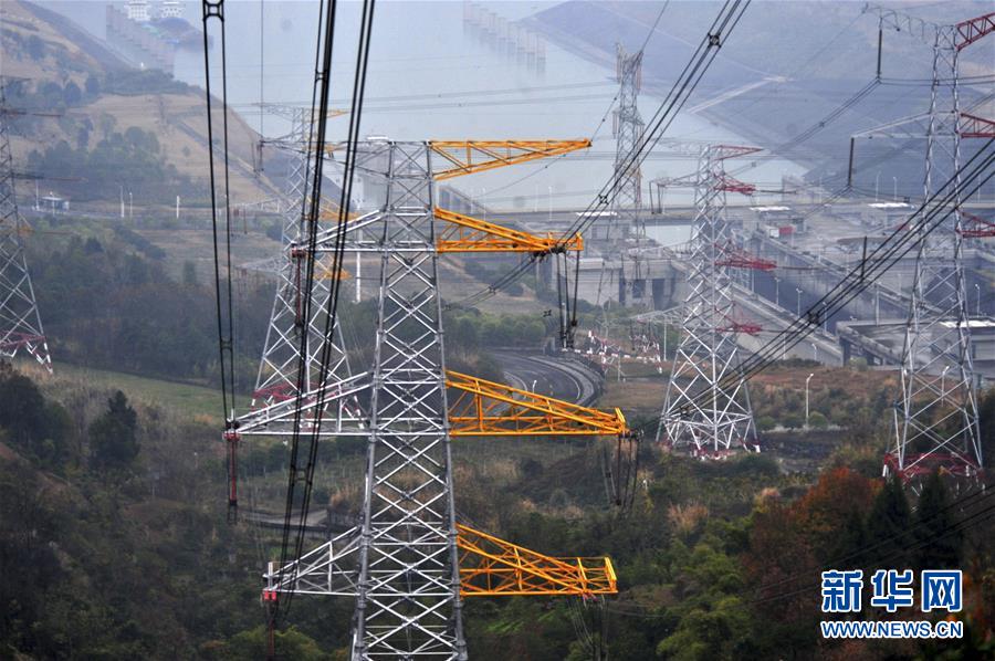 这是12月21日在三峡大坝左岸的湖北省宜昌市夷陵区太平溪镇拍摄的输电铁塔。 新华社发(张国荣 摄)