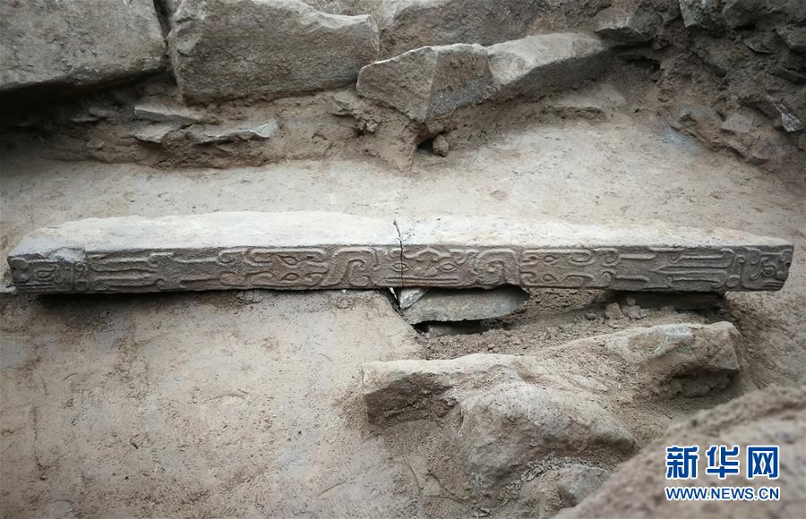 这是陕西神木石峁遗址皇城台大台基南护墙石雕遗存(陕西省考古研究院供图)。 新华社发