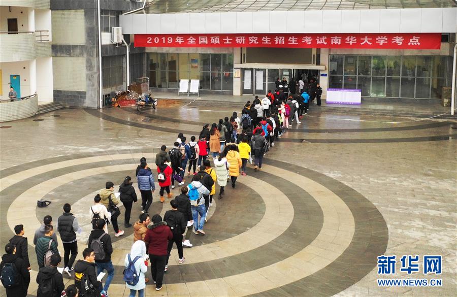 12月22日,在位于湖南衡阳的南华大学考点,考生们排队依次进入考场(无人机拍摄)。