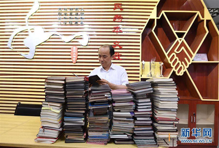 马善祥在位于重庆的老马工作室内整理自己的工作笔记本(2017年6月23日摄)。