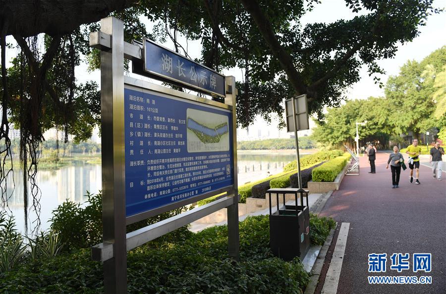 12月22日拍摄的广西南宁市南湖边的湖长公示牌。 记者从广西南宁市全面建立河长制湖长制情况新闻发布会上获悉,南宁已建立市、县、乡、村四级河长、湖长组织体系,明确四级河长3047名、四级湖长45名,实现了四级河长、湖长全覆盖。 新华社记者 陆波岸 摄