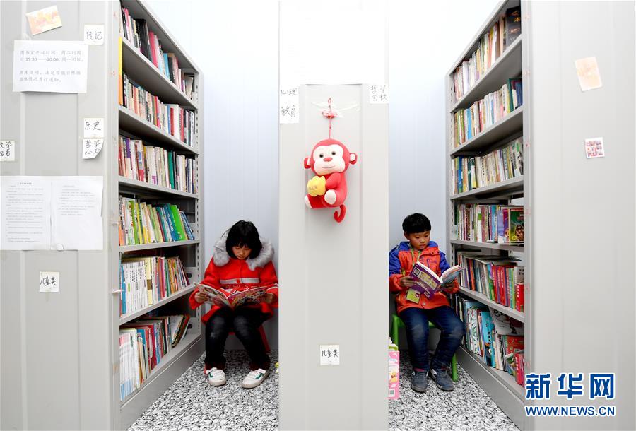 12月22日,两名儿童在陕西省西安市长安区长里村公益图书室里看书。