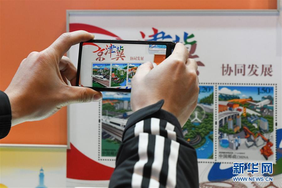 12月22日,参观者在“筑梦新时代”邮票展台前用手机拍摄展出的邮票图样。