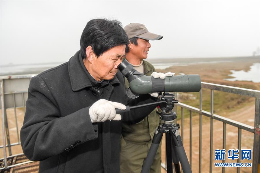 12月22日,王三益(前)在菜子湖湿地观测候鸟。 新华社记者 张端 摄