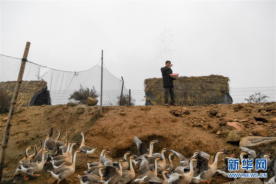 12月22日,王三益在给受伤的灰雁喂食,等到养好伤再将它们放飞。 新华社记者 张端 摄