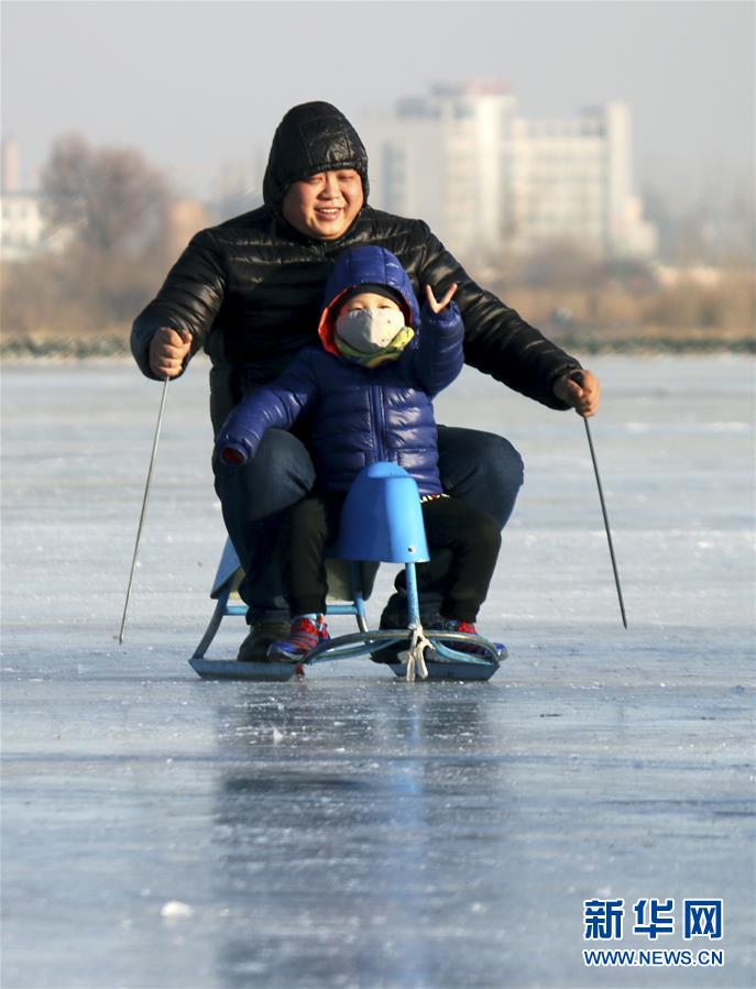 12月23日,甘肃张掖市民带着孩子在张掖市国家湿地公园滑冰场滑冰车,享受冰雪的乐趣。 新华社发(成学磊 摄)