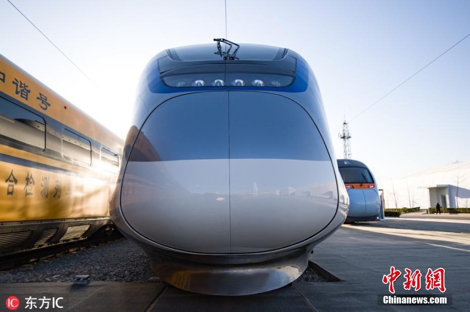 2018年12月24日,中国铁路科技创新成就展在北京国家铁道试验中心开幕,一大批中国自主研发的先进铁路技术装备集中展出,时速350公里17辆长编组、时速250公里8辆编组、时速160公里动力集中等多款复兴号新型动车组首次公开亮相。 图片来源:东方IC 版权作品 请勿转载