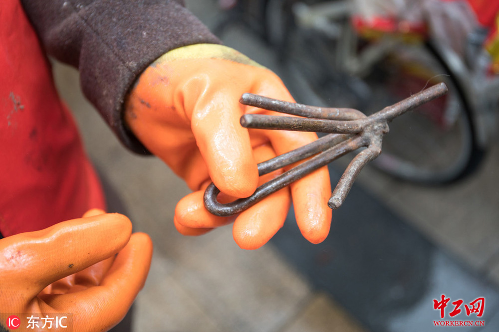 老戚的工具包放着一些长短不一、粗细不同、形状各异的工具,为了提高疏通效率的效率,戚师傅还自行设计制作了一批管道疏通工具。经过多年的摸索实践,戚宝兴已成为疏通各类下水道、解除“疑难杂症”的行家。