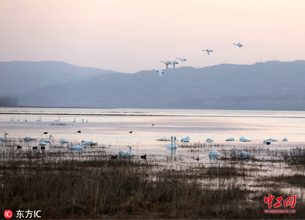 2018年12月23日,入冬以来,约1.1万只大天鹅飞抵黄河湿地三门峡库区栖息越冬,上演壮观唯美的冬日天鹅舞。
