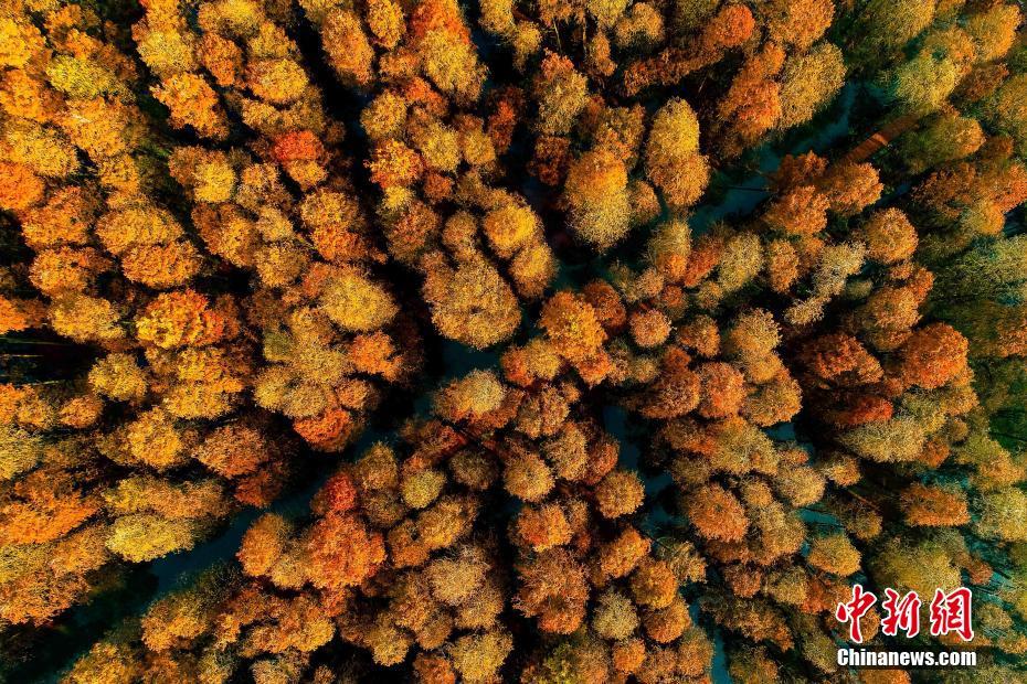 2018年12月23日航拍的泰州兴化李中水上森林景色。进入冬季,李中水上森林景区层林尽染、云雾缭绕、色彩斑斓,美如画卷。李中水上森林景区占地面积2000亩,林木蓄积量1.25万立方米,形成“林中有水、水中有鱼、林内有鸟、河流回环、水杉林立”的生态湿地景观。 图片来源:CNSPHOTO