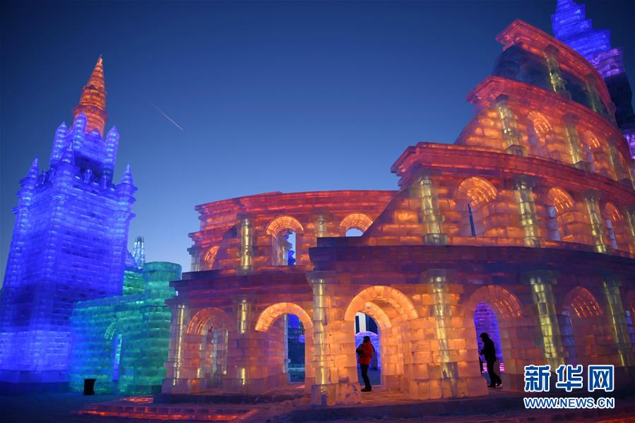 12月23日,游客在哈尔滨冰雪大世界园区拍照。