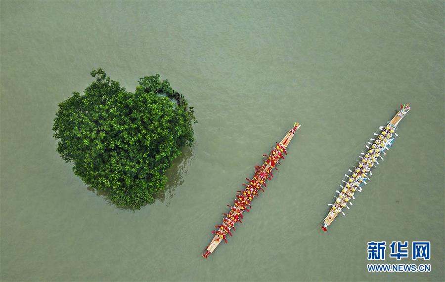 6月14日,两艘龙舟行驶在浙江省温州市南塘老街附近一处水域(无人机拍摄)。 在即将过去的2018年,各地摄影师用镜头记录下四季中国。大江南北,一幅幅色彩斑斓的美丽画卷徐徐展开。 新华社发(苏巧将 摄)