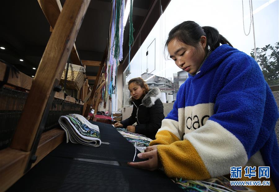 12月24日,在湖南省张家界市武陵源区乖幺妹土家族织锦基地,工人在制作织锦产品。新年临近,张家界市武陵源区土家族织锦企业加紧制作手提包、服饰、家居装饰品等织锦产品,供应节日市场。土家族织锦技艺历史悠久,2006年入选首批国家级非物质文化遗产名录。近年来,当地依托旅游资源优势,扶持土家族织锦产品向规模化、精品化发展。目前,武陵源区开发的织锦产品已有100余种。新华社发(吴勇兵 摄)