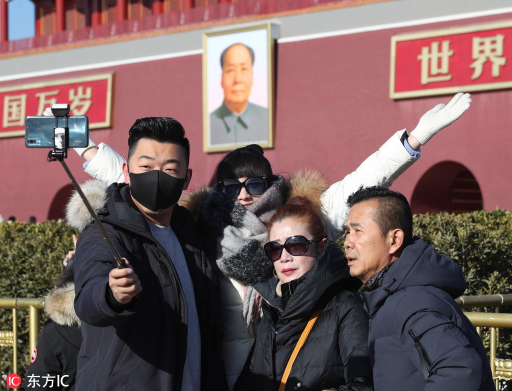 2018年12月25日,北京,寒风中游客裹得严严实实游览天安门广场热情不减。当天冷空气如约抵京,刮起4级左右偏北风,阵风达到7级,最高气温只有3度,风寒效应明显寒意十足。北京气象台发布大风和持续低温“双蓝”预警,提醒市民注意防寒保暖。/东方IC