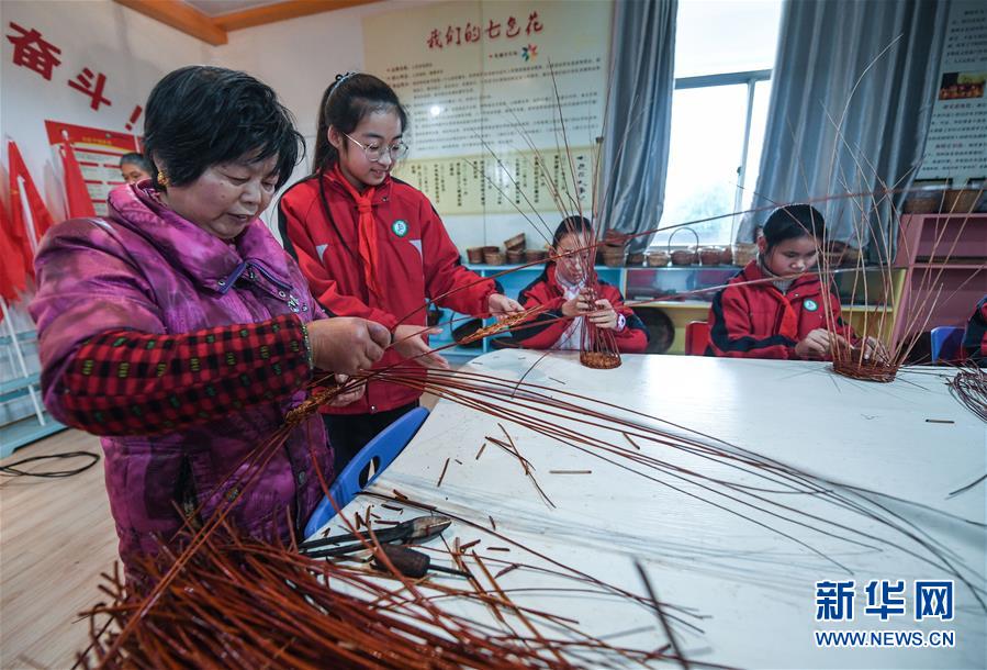 12月26日,柳编艺人陈林妹(左一)在教学生们制作柳编工艺品。