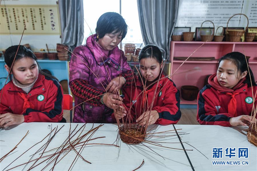 12月26日,柳编艺人陈林妹(左二)在教学生们制作柳编工艺品。