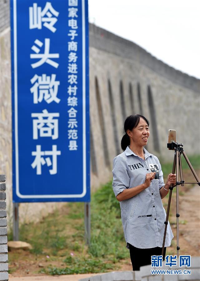 7月4日,山西省武乡县岭头村微商李润红在网络直播。武乡县是国家级电子商务进农村综合示范县,当地加大培养农村电商人才、加快农村网络建设。很快,岭头村有了农民微商培训基地。李润红参加微商培训后,开始尝试卖自家的农产品。她采取“直播+销售”的方式,将自家的农产品卖到全国各地。目前,岭头村开微店人数达100余人,“微商”们在自产自销的同时,还帮助村里其他村民卖农产品,走上了致富的道路。