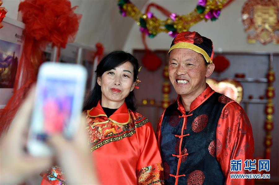 2月23日,在山西省永和县奇奇里村,村民拿着手机给新郎冯文忠和新娘刘翠翠拍照留影。 奇奇里村是山西省永和县黄河乾坤湾对岸山崖上的一个贫困村。在扶贫干部的带动下,奇奇里村大力发展认养农业、民宿休闲、乡村旅游等产业。贫困户冯文忠加入了村里组织的劳务工作队,在山沟里植树造林,把自家的窑洞改造成农家乐,钱袋子渐渐鼓了起来。2018年,大龄“光棍”冯文忠娶了媳妇,脱贫之后又“脱单”。
