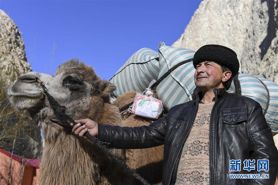 11月17日,都热·加尔曼牵着驮有搬迁行李的骆驼告别喀喇昆仑山,迎接新生活。 2018年以来,新疆塔什库尔干塔吉克自治县对居住在艰苦偏远山区、生产生活资料匮乏的贫困户,陆续实施易地扶贫搬迁,统筹各项扶贫和保障措施,帮助搬迁来的贫困百姓“住得下、能致富”。