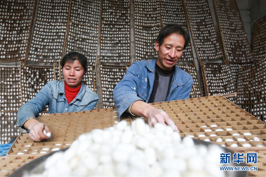 11月12日,在贵州省毕节市双山镇普陆村,杨天勇(右)和妻子罗艳在摘蚕茧。 40岁的杨天勇是双山镇普陆村村民,因家境贫寒,17岁就前往浙江一带打工。2015年,得知家乡大力推进产业结构调整、鼓励农民种桑养蚕时,杨天勇带着妻儿返乡,投身养蚕创业。 2018年,杨天勇开始带动50户农民投身养蚕,让“蚕宝宝”成了脱贫的“金宝宝”。下一步,他将带着乡亲们勤劳苦干,一起走上致富路。