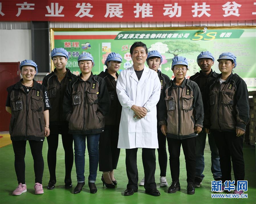 在宁夏西吉县,来自福建莆田的林玉清(左五)与员工合影(8月30日摄)。林玉清2017年在西吉县成立宁夏泽艾堂生物科技有限公司,依托西吉县优质的艾草种植条件,采用“公司+合作社+农户”的订单农业合作模式,与吉强、新营等乡镇种植专业合作社合作建成艾草种植基地11个、推广种植艾草6000亩,为当地群众脱贫致富铺就新路子。