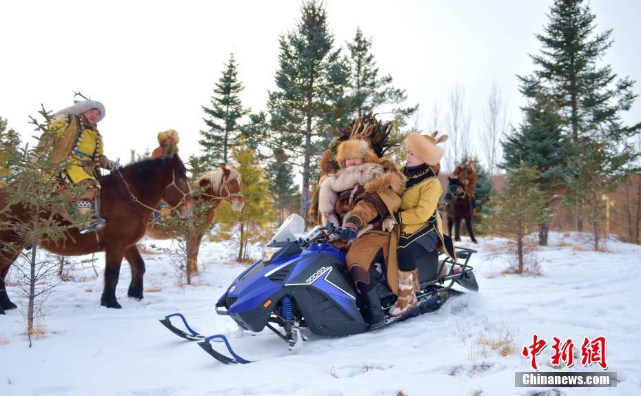 12月26日,第五届鄂伦春冰雪伊萨仁(鄂伦春语,意为“集会”)在内蒙古自治区呼伦贝尔市鄂伦春自治旗开幕。图为鄂伦春族青年驾驶雪地摩托穿梭于林海。中新社记者 侯玉鹏 摄
