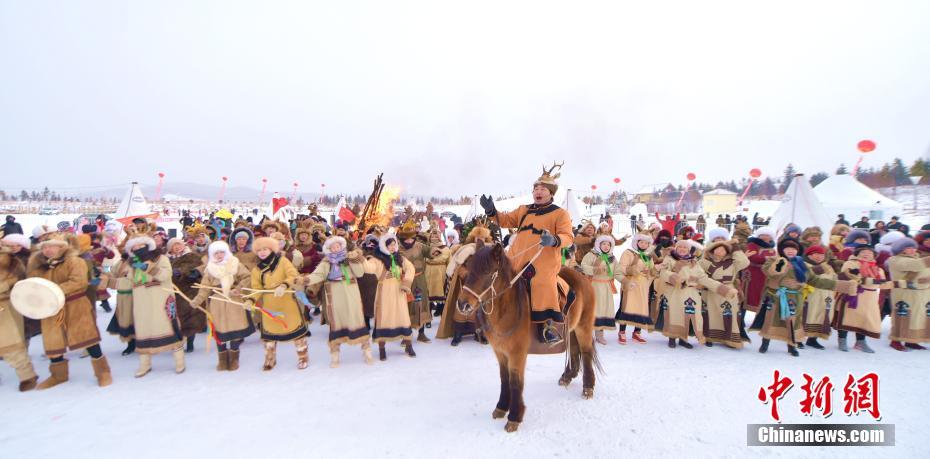 12月26日,第五届鄂伦春冰雪伊萨仁(鄂伦春语,意为“集会”)在内蒙古自治区呼伦贝尔市鄂伦春自治旗开幕。图为鄂伦春族民众欢歌鹊舞欢度节日。中新社记者 侯玉鹏 摄