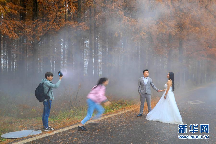 12月26日,在江苏省淮安市盱眙县铁山寺景区,在天泉小镇居住并从事婚纱摄影工作的张建国(左一)与同事在为新人拍摄婚纱照。