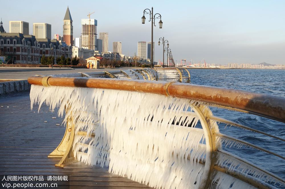 自12月25日夜间,一股强冷空气的主体抵达大连以来,城区气温持续下降并伴有大风,截至12月27日,大连市区最低气温在-13℃左右徘徊。在大风和潮汐的作用下,大连东港海岸边的护栏挂上了美丽的冰凌。刘德斌/人民图片