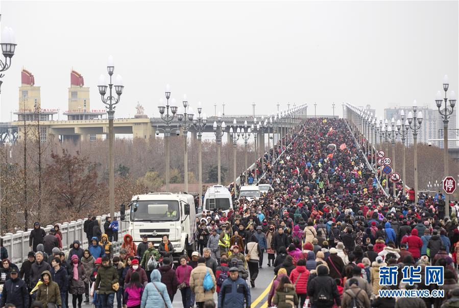 12月27日,南京长江大桥上人头攒动。 12月26日起,经过27个月全封闭维修改造的南京长江大桥公路桥向公众开放三日。开放以来,大桥吸引众多市民和游客前往参观。建成于1968年的南京长江大桥是长江上第一座由我国自行设计和建造的特大型公铁两用桥梁,在中国桥梁史具有里程碑意义。 新华社发(王新 摄)