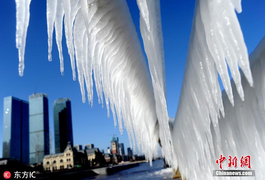 2018年12月28日,渤海大连北部海域潮水涌上岸边,在堤坝的护栏上凝结成千姿百态的冰凌奇观。随着北方持续低温,渤海大连海域的海水在潮汐和大风的作用下涌上岸边,在护栏上凝结成大面积的冰凌景观。图片来源:东方IC 版权作品 请勿转载
