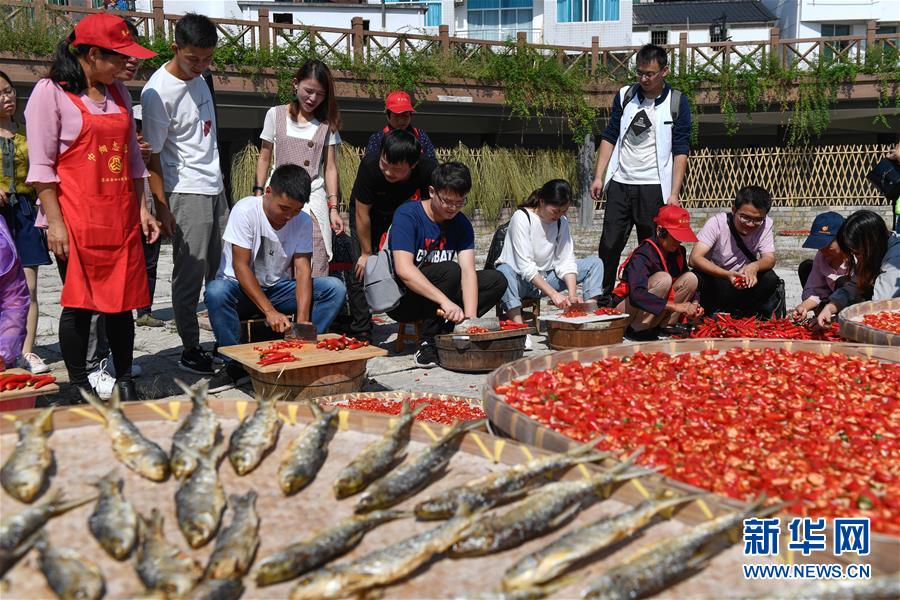 9月30日,游客在浙江省淳安县界首乡鳌山村与村民一起切辣椒、做特色鱼干酱。近年来,浙江省淳安县界首乡鳌山村发展起一批具有渔村特色的民宿。 2018年是全面贯彻党的十九大精神的开局之年,农业发展稳中有进,打赢脱贫攻坚战三年行动开局良好,乡村建设迈出新的步伐,农村改革深入推进,农村社会保持和谐稳定,“三农”持续向好形势进一步巩固。 新华社记者 黄宗治摄