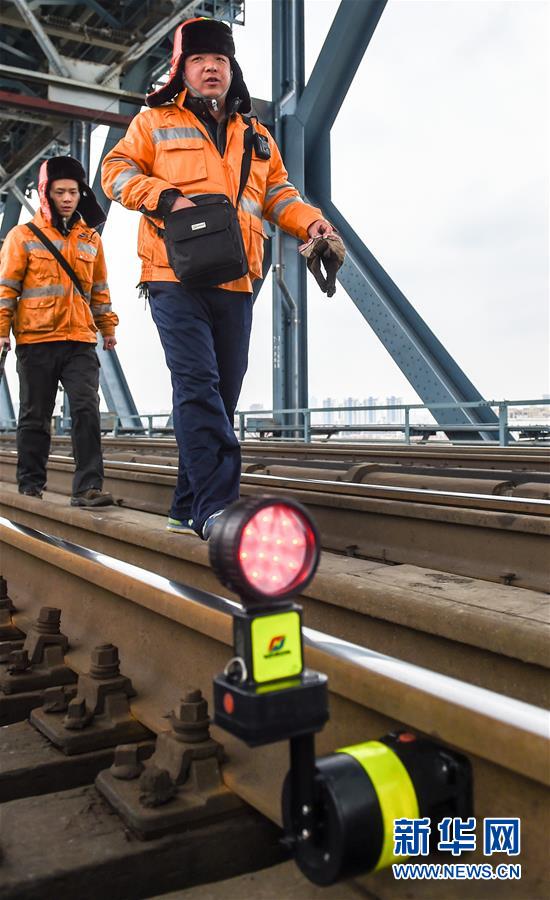 郑炜(右)和工友在南京长江大桥铁路桥上进行日常巡查(12月27日摄)。