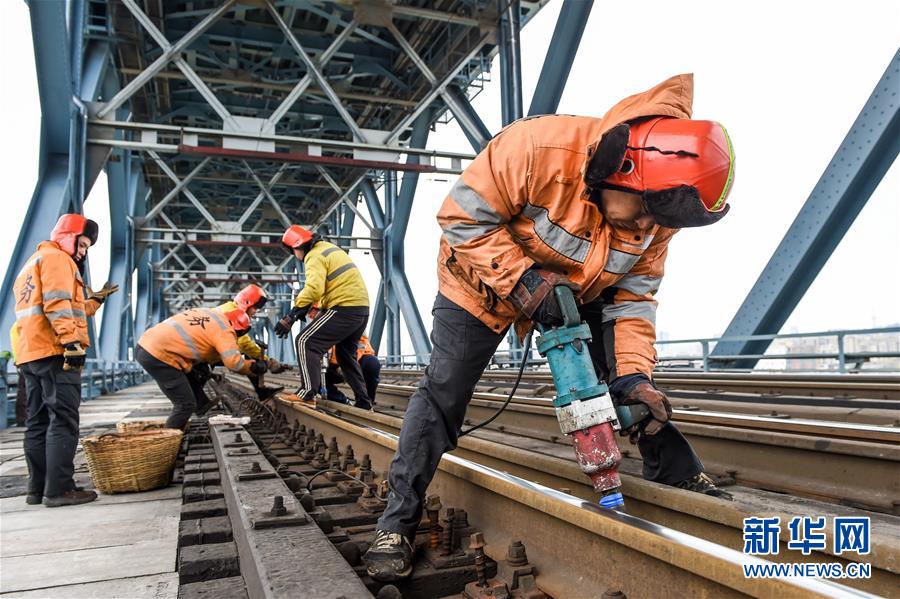 线路工刘非(右一)在南京长江大桥铁路桥进行木枕改道作业(12月27日摄)。