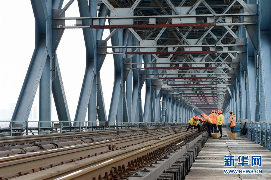 线路工们在南京长江大桥铁路桥进行木枕改道作业(12月27日摄)。