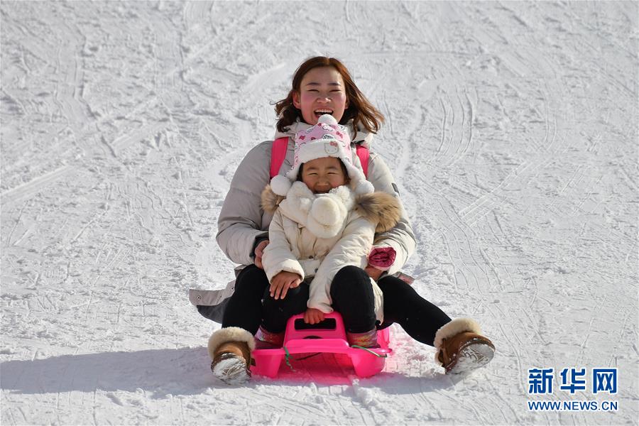12月30日,在山东省烟台市南里滑雪公园,家长带着小朋友体验雪上娱乐。元旦假期第一天,人们用享受冰雪乐趣的方式,喜迎新年。新华社发(孙文潭 摄)